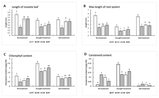 Statistical analysis of plant height and chlorophyll and carotenoid contents in transgenic and WT Arabidopsis. The transgenic and wild-type Arabidopsis grown in MS agar plates for 14 days: 200 mM Nacl and 500 mM mannitol were added to MS medium in drought treatment and salt treatment groups, respectively. (A,B) Length of rosette leaf (A) and maximum length of root system (B) in transgenic lines and wild-type. Different letters above the columns indicate significant differences (p ≤ 0.05, n = 20). (C,D) Chlorophyll (C) and carotenoid (D) contents in transgenic lines and wild-type Arabidopsis. Different letters above the columns indicate significant differences (p ≤ 0.05, n = 3).