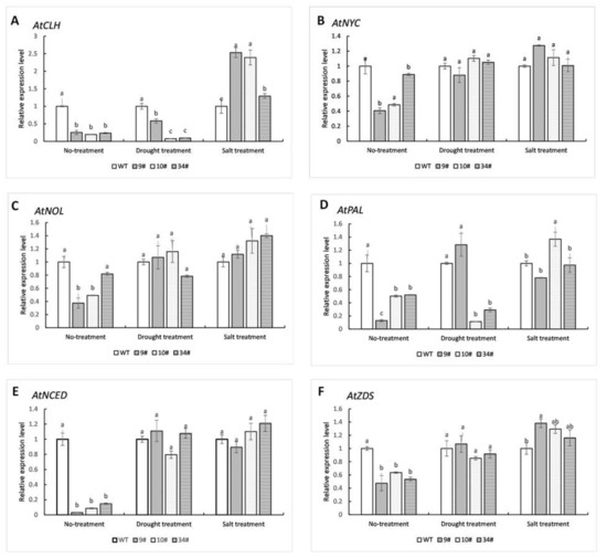 Pigment-related gene expression level of wild-type and transgenic plants subjected to no-treatment, drought, and salt stress conditions. Pigment-related genes include AtCLH (A), AtNYC (B), AtNOL (C), AtPAL (D), AtNCED (E), and AtZDS (F). WT in no-treatment, drought treatment, or salt treatment was set as calibrator sample with a relative expression equal to 1.