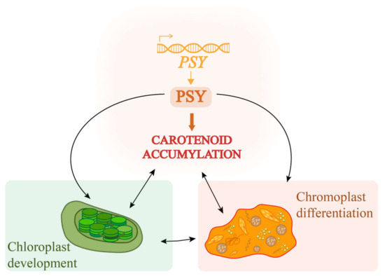 Molecular schematic of PSY’s involvement in carotene accumulation and chloroplast development in plants [1]. The development of chloroplasts and chromoplast differentiation are related to PSY activity and sink capacity for carotenoids.