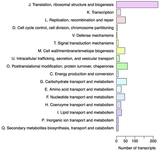 The description and functional classification of orthologous proteins was carried out in the EGGNOG database. Nine hundred and eighty-eight orthologous protein sequences were assigned from other species already annotated, such as that of A. thaliana. These sequences were classified into 17 different functional groups, among which the category translation, ribosomal structure, and biogenesis identified with section J. stand out, with 85% of the total hits (Figure 2). In contrast, the defense mechanisms category (V) contains the lowest number of sequences expressed with 5%.