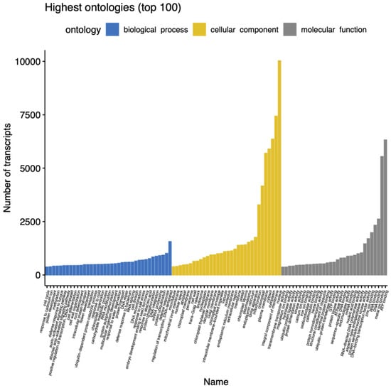Regarding the classification of gene ontology (GO), a total of 43,640 transcripts were assigned, distributed in 99 different functional groups, and divided into three main categories: (a) cellular component, having around 60% of the total expressed gene sequences, of which, the highest number of hits correspond to genes related to nuclear function; (b) molecular function, corresponding to 30% of the transcripts, most of which are related to ATP binding, and (c) biological processes, which account for approximately 10% of the total hits; among them, the category with the highest number of Gene sequences are those related to the function of the regulation of transcription (Figure 3). GO terms were inferred using the annotation of genes that had blast matches with proteins belonging to the UniprotKB database.