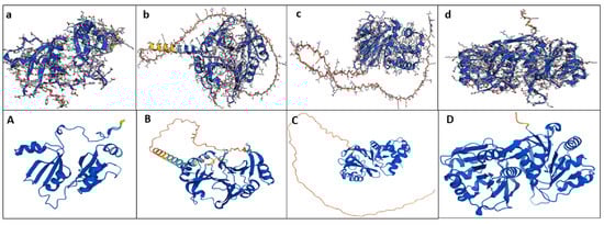 The prediction of the 3D structure modeling of the putative protein sequences was performed with the program AlphaFold Colab [https://colab.research.google.com/github/deepmind/alphafold/blob/main/notebooks/AlphaFold.ipynb (accessed on 4 January 2022)] (Jumper et al. 2021, Varadi et al. 2021). The protein–protein interaction analysis was carried out using the STRING platform (https://string-db.org/ (accessed on 26 December 2021)) [].