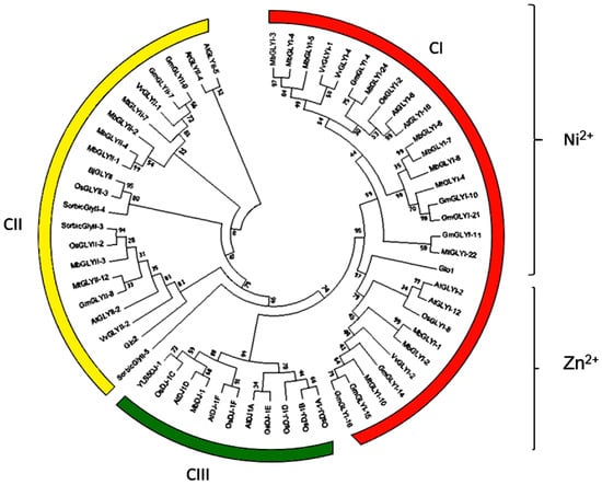 Phylogenetic analysis for all members of MbGLY and other species shows three main groups (Figure 5). In the CI group (orange) are all the GLYI, and this group is divided into two subgroups, in the first one are those dependent on Zn2+ (MbGLYI-1 and MbGLYI-2), and they are closely related to OsGLYI-8, AtGLYI-2, AtGLYI-12, VvGLYI-2, and GmGLYI-16 (Figure 5). In subgroup 2 of the CI group, the Ni2+-dependent GLYI are found, which in turn are distributed in two groups. In the first group are MbGLYI-3, MbGLYI-4, and MbGLYI-5, very close to those of VvGlyI-1 and VvGlyI-4 Vitis vinifera. In contrast, MbGLYI-6, MbGLYI-7, and MbGLYI-8 are closely related to GmGLYI-10 and GmGLYI-21 of glycine max. In group CII (yellow), members of the MbGLYII family are seen. In subgroup 1 are MbGLYII-1, MbGLYII-2, and MbGLYII-4, which are closely related to AtGLYII-4 and VvGLYII-1, whereas in subgroup 2, MbGLYII-3 is related to VvGLYII-2. In group CIII (green) are the GLYIII, and here is located MbDJ-1, which has a close relationship with AtDJ1D of A. thaliana.
