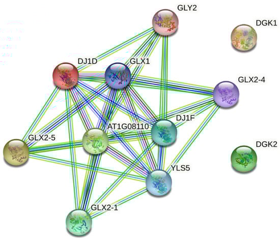 The IPP results were obtained from the orthologs for At1g8110 (MbGLYI-1), At1g67280 (MbGLYI-2), Glx2-5 (MbGLYII-1), Gly2 (MbGLYII-4), and DJ1D (MbDJ-1) (Figure 6). The five query proteins of M. bombycina interact with five others: 4 glyoxalases and a glutamine amido-transferase-like enzyme (YLS5). The analysis of the IPP in the STRING database shows that there are 11 nodes connected with 30 different edges, and the average node degree was 5.45, which means that at least one node has 5.45 interacting nodes. The IPP network shows that all proteins interact with each other (except for DGK1 and DGK2 which are the negative controls). The closest interaction between each protein is based on its score; thus, At1g08110 (MbGLYI-1) has an interaction with GLY2 with a score of 0.993. At1g67280 (MbGLYI-2) interacts with GLY2-I, GLY2-4, and GLY2-5, all with a score of 0.992. GLY2-5 interacts with At1g8110 (MbGLYI-1) with a score of 0.992. GLY2 interacts with At1g8110 (MbGLYI-1) with a score of 0.993. GLY-2 (MbGLYII-4) and DJI-D (MbDJ-1) interact with At1g8110 (MbGLYI-1) with a score of 0.965. Two sequences of the M. bombycina transcriptome encoding a two isoforms of Diacylglycerol kinase 2 was used as a negative control (DGK1 and DGK2).