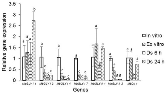Expression analysis of MbGLYI, MbGLYII, and MbDJ-1 genes. The MbGLYI-1 gene shows a higher expression in the 24 h dehydration treatment, whereas MbGLYI-3, MbGLYI-4, and MbGLYI-7 expression decreased in all treatments compared to the control. For MbGLYII-1, a higher expression was presented in the ex vitro treatments and dehydration 24 h compared to the control. The expression in MbGLYII-3 is significantly lower in all treatments with respect to the control. In the case of MbDJ-1, the expression was maintained for the ex vitro treatments and dehydration at 24 h compared to the control; however, in the dehydration treatment 6 h, there was a significant decrease in the expression compared to the control. Different letters above the bars (a–h) represent a significant difference (p = 0.05) in Tukey test.