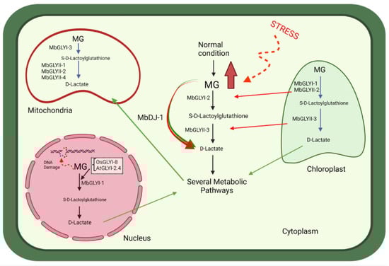 Hypothetical model proposed for the detoxification of MG through the glyoxalase pathway in various subcellular organelles in M. bombycina. The role hypothetically played by each of the putative proteins MbGLYI, MbGLYII, and MbDJ-1 in vegetal cells is observed.