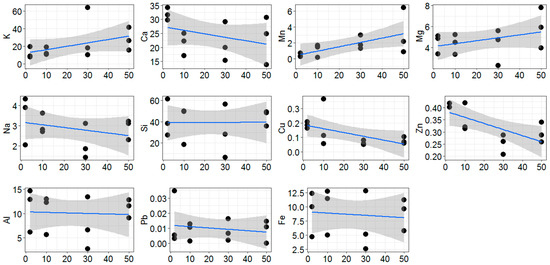| Al | 11.2 ± 2.6 a | 10.3 ± 2.4 a | 7.5 ± 3.1 a | 11.2 ± 1.1 a | 0.68 |