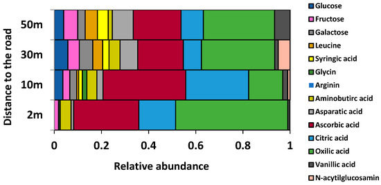 3.2. Phylloplane: Sensitive Indicators to Distance from the Road
