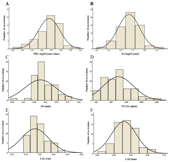 Histogram of normal distribution curves for root morphological traits. In the figure, each abbreviation indicates (A) total root length (TRL), (B) surface area (SA), (C) average diameter (AD), (D) number of tips (NT), (E) link average length (LAL), and (F) link average diameter (LAD).