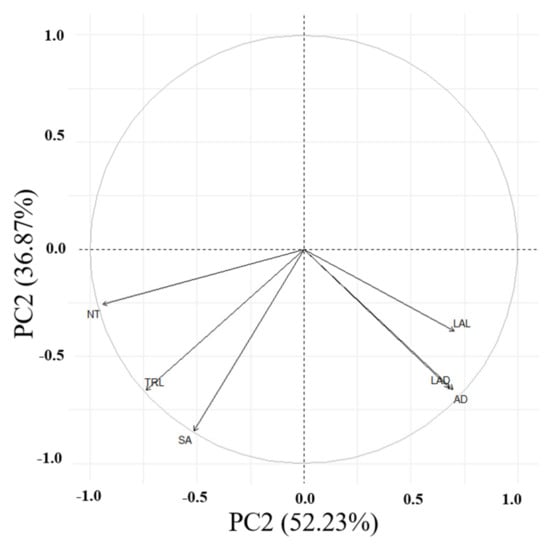 Principal component analysis of six root traits for the adzuki bean accessions. PC1 vs. PC2 represents 89.10% of the total variation. Abbreviations: TRL, total root length; SA, surface area; AD, average diameter; NT, number of tips; LAL, link average length; LAD, link average diameter.