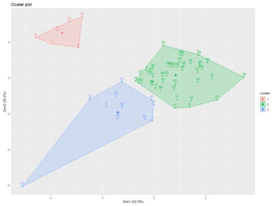 Visualization of the spatial relationships between adzuki bean accession clusters formed by plotting the first two dimensions. Dots with different colors indicate comparable accessions gathered together in a cluster. The results of K-means clustering (three clusters) using the first two principal component analysis dimensions are shown using different colors representing cluster distributions.