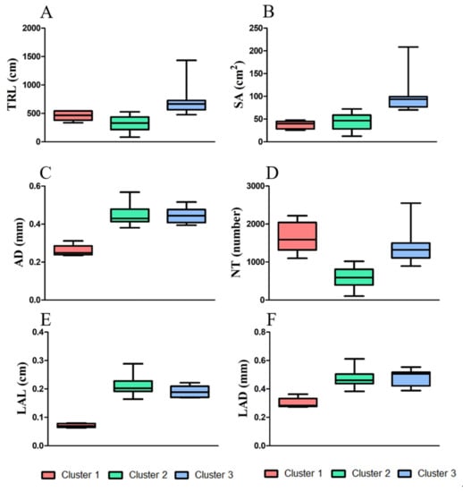 Box plots displaying the measured root traits for individual clusters, and according to the number of accessions belonging to each cluster. The central value and variability of the 61 accessions are based on the three clustering groups obtained from K-means cluster analysis. The six root traits were plotted as follows: (A) TRL, total root length; (B) SA, surface area; (C) AD, average diameter; (D) NT, number of tips; (E) LAL, link average length; and (F) LAD, link average diameter.