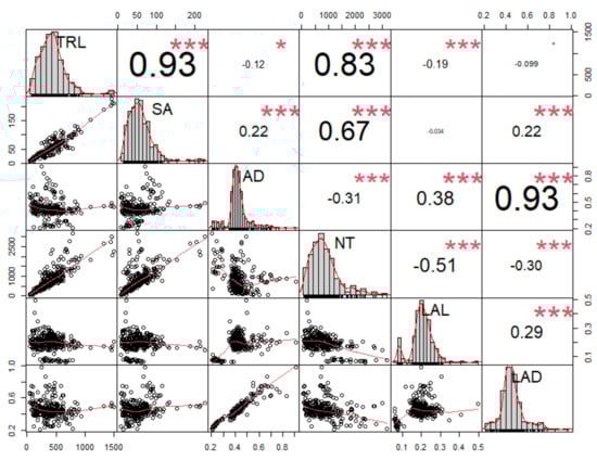 Correlation analysis between six root traits (TRL, SA, AD, NT, LAL, and LAD) in 61 adzuki bean wild accessions examined 35 days after planting at the second or third trifoliate leaf stage. Abbreviations: TRL, total root length; SA, surface area; AD, average diameter; NT, number of tips; LAL, link average length; LAD, link average diameter. In the figure, asterisks (*) represent significance at the 0.05 level; p ≤ 0.01 (*), p ≤ 0.001 (**), and p ≤ 0.0001 (***).