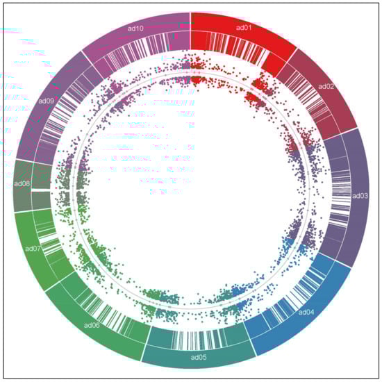 Distribution of DEGs on the Arachis duranensis chromosomes. Distribution of the 5751 A. stenosperma DEGs (colored lines) in the ten chromosomes of A. duranensis (ad01 to ad10). The inner dots represent the distribution of log2FC values for each up- and downregulated DEG, with the line indicating log2FC = 0.