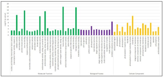 Gene Ontology (GO) terms enrichment analysis was performed for the 5751 DEGs that could be assigned to the three main GO functional categories, being the molecular function the category with more enriched terms (27), followed by cellular component (18) and biological process (13) (Figure 2). The molecular function category showed the terms with the highest p-values (>12) of -log10, such as catalytic activity, iron ion binding, oxidoreductase activity, heme and tetrapyrrole binding, which could be involved in triggering the oxidative and stress responses. In addition, terms associated with transcription factor and kinase activities, both associated with defense priming, were also enriched (Figure 2). In the biological process category, two terms (photosynthesis and oxidation-reduction process) showed p-values higher than 5.6, whereas the other terms were similarly enriched with p-values around 3 (Figure 2). Both molecular function and biological process categories agreed with the most enriched cellular component terms found in this analysis (photosystem; membrane- and thylakoid-associated terms), which are also important components in general plant responses towards stresses (Figure 2).