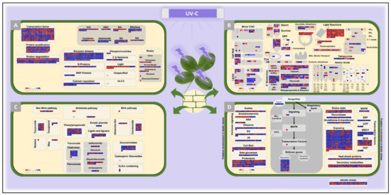 MapMan functional classification analysis of Arachis stenosperma DEGs. Functional overview of A. stenosperma DEGs related to the plant cell regulatory (A), general metabolic (B), secondary metabolic (C), and biotic stress-related (D) pathways. Blue and red dots mean up- and downregulated DEGs, respectively, in response to UV-C treatment.