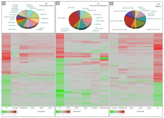 Distribution of Arachis stenosperma DEGs into plant regulator gene families. Distribution of A. stenosperma DEGs into gene families of transcription factors (A), transcriptional regulators (B), and protein kinases (C) during the response to UV-C exposure and heatmap of their relative expression under six stress treatments, with normalized log2FC values in a red-green scale.