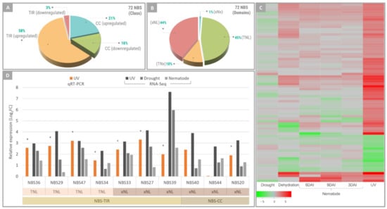 To further analyze these effects, a more detailed expression analysis by qRT-PCR was carried out using a subset of ten NBS-LRR genes (Table S2), comprising different subfamilies (TNL and xNL) and showing distinctly in silico expression magnitudes. As a whole, the expression behavior of all of the ten NBS-LRR representatives in response to UV inferred from in silico analysis was validated by qRT-PCR (Figure 5D), with all genes displaying upregulation behavior, with variable expression levels depending on the stress imposed (UV, drought or nematode infection) (Figure 5D). These findings suggest that some NBS-LRR genes, which are a class of R genes generally triggered by specific biotic stresses in A. stenosperma [45,46,48,52], can also respond to more severe and unspecific stresses, such as UV and dehydration, and therefore be associated to the general resistance/tolerance of this wild species to stressful conditions.