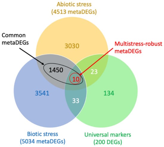 Aiming to identify genes that are commonly responsive to a broad spectrum of primary stimulus, we performed a meta-analysis comparison of abiotic and biotic stress responses in A. stenosperma by analyzing our previous transcriptomic datasets (Table S3) [28,46,53]. For meta-analysis, the six RNA-Seq libraries from abiotic stress treatments (UV exposure, dry-down, and dehydration) were analyzed separately from those of the four biotic stress treatments (nematode inoculation) (Table S3). Overall, we found 4513 metaDEGs commonly regulated, showing the same expression trend (up- or downregulation) in response to abiotic stresses and 5034 upon biotic stresses (Figure 6). Of these, 1460 (18%) metaDEGs were shared among all biotic and abiotic analyzed studies. They were thus considered here as common metaDEGs responsive to a wide range of stresses in A. stenosperma (Figure 6), being ten of them further identified as ‘multistress-robust metaDEGs’ (see below). This result indicated that most DEGs were uniquely modulated by either abiotic or biotic stress, and A. stenosperma may use distinct transcriptional mechanisms to deal with different stresses, as previously reported in wild Arachis species plants submitted to individual and combined stresses [53]. This metaDEGs dataset was further screened for putative plant priming genes responsible for initiating non-specific defense responses in many species.