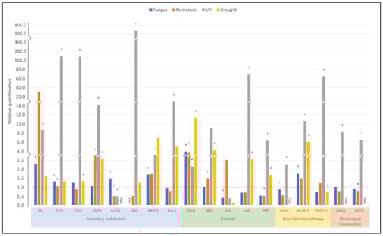 More detailed expression analysis was conducted by qRT-PCR for another 18 A. stenosperma previously associated with priming phase (Table S2), such as genes involved in secondary metabolism (IRL, STS, UGT, BBE, N8DT, and PAL); cell wall structure and integrity (EXLB, EGC, FLA, LAC, and PRP); basal defense pathways (eGCL, NUDT, SYP); or stress signal transduction (LOB, AKT) [8,19,55,56,57,58,59,60]. These candidate genes were selected among the 1460 metaDEGs identified here as commonly regulated by a broad range of primary stresses (Figure 6). In addition to UV exposure, the expression behavior of these 18 candidate genes was also analyzed in A. stenosperma RNA samples previously collected from roots subjected to dry-down treatment (drought) [61] or infection with M. arenaria [62] and leaves challenged with C. personatum [45].