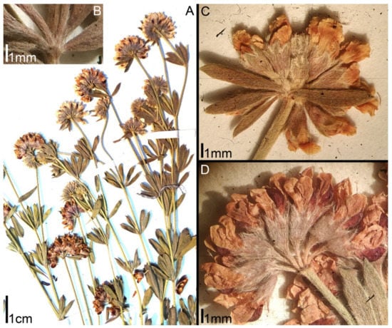 - Lotus dorycnium ssp. anatolicus (Boiss. & Heldr.) Kramina & D.D. Sokoloff, comb. nov. (Basionym: Dorycnium anatolicum Boiss. & Heldr. 1849, Diagn. Pl. Orient. ser. 1, 9: 31; Synonym: Dorycnium pentaphyllum ssp. anatolicum (Boiss. & Heldr.) Gams) (Figure 5A,B). Distribution range: Asiatic Turkey, Syria, Lebanon [11,13].