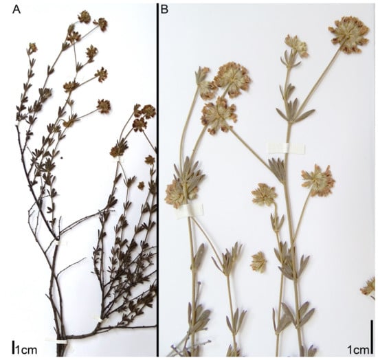 - Lotus dorycnium ssp. dorycnium (Synonyms: Dorycnium pentaphyllum ssp. pentaphyllum; Dorycnium pentaphyllum ssp. suffruticosum Bonnier & Layens; Dorycnium pentaphyllum ssp. transmontaum Franco) (Figure 4). Distribution range: Portugal and West Mediterranean (Spain, France, Italy, Algeria, Tunisia) [11,13].