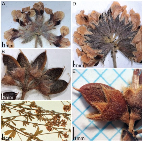 - Lotus dorycnium ssp. haussknechtii (Boiss.) Kramina & D.D. Sokoloff, comb. nov. (Basionym: Dorycnium haussknechtii Boiss. 1872, Fl. Orient. 2: 163; Synonym: Dorycnium pentaphyllum ssp. haussknechtii (Boiss.) Gams) (Figure 5C–E). Distribution range: Asiatic Turkey, Syria, Lebanon, Bulgaria [11,13,16].