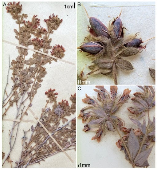 - Steinberg, E.I. Dorycnium L. In Flora SSSR [Flora of the USSR]; Publishers of Academy of Sciences of USSR: Moscow, Russia, 1945; Volume 11, pp. 281–284. (In Russian) [Google Scholar]