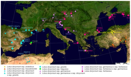 - Lotus dorycnium ssp. germanicus (Gremli) Kramina & D.D. Sokoloff, comb. nov. (Basionym: Dorycnium jordanii subsp. germanicum Gremli 1889, Excursionsfl. Schweiz, Ed. 6.: 496; Synonyms: Lotus germanicus (Gremli) Peruzzi; Dorycnium pentaphyllum ssp. germanicum (Gremli) Gams; Dorycnium germanicum (Gremli) Rouy) (Figure 3). Distribution range: the largest continuous part: much of the former Yugoslavia, Albania, Northern Greece, W part of Bulgaria and southwestern Romania; minor part: Eastern Alps, Eastern Switzerland, Bavaria, and the Pannonian region [12].