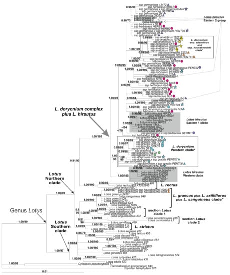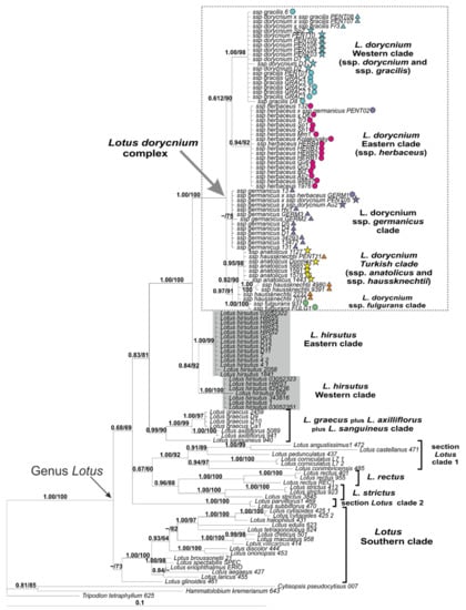 - Kramina, T.; Lysova, M.; Samigullin, T.; Schanzer, I.; Özbek, M.; Sokoloff, D. Phylogenetic placement and phylogeography of large-flowered Lotus species (Leguminosae) formerly classified in Dorycnium: Evidence of pre-pleistocene differentiation of western and eastern intraspecific groups. Plants 2021, 10, 260. [Google Scholar] [CrossRef]