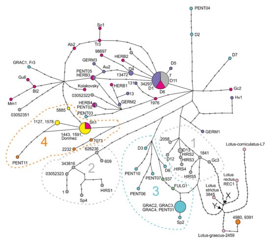 - Kramina, T.E.; Meschersky, I.G.; Degtjareva, G.V.; Samigullin, T.H.; Belokon, Y.S.; Schanzer, I.A. Genetic variation in the Lotus corniculatus complex (Fabaceae) in northern Eurasia as inferred from nuclear microsatellites and plastid trnL-trnF sequences. Bot. J. Linn. Soc. 2018, 188, 87–116. [Google Scholar] [CrossRef]