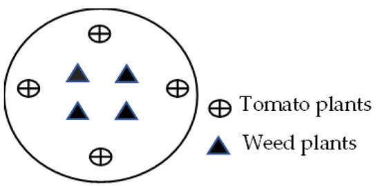 Pots of 10 L were filled with a mixture of field soil and commercial potting mix (2:1). Field soil was used as the growth medium to minimize chemical inhibition by using the organic substrate. To avoid water contact with plant shoot, the pots were placed in trays filled with water according to their necessity. Four tomato plants and four plants of a single weed species were colocated in the same potting container (Figure 1). Thus, tomato plants could interfere with weed species either by competition or by generating chemical interference due to the release of allelochemicals from root exudates. In our context, this screening involves tomato cultivars that are able to suppress the target weeds due to their robust morphological and natural genetic traits. Tomato and weeds were direct-seeded at equal spacing. Tomato seeds were placed on the edge of the pot, while the seeds of the weed species were sown at the center of the pot. At the moment of emergence, four tomato plants and four weed plants were kept per pot.