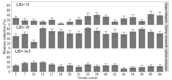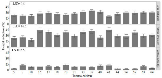 Weed-suppressive ability of tomato cultivars on biomass reduction (%) of Palmer amaranth, large crabgrass, and yellow nutsedge at 28 days after sowing. Four tomato plants and four plants of a single weed species were grown together in the same pot. The reduction values were based on a comparison to plants of individual weed species grown as a control treatment without tomato interference. Error bars represent the standard deviation of the mean. The difference between the two mean values is compared to the least significant difference (LSD) value. If the difference was greater than the LSD value, then the means are significantly different according to Student’s t-test at a 0.05 probability level.