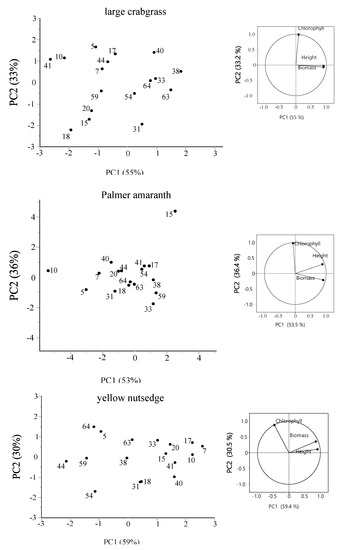 A principal component analysis (PCA) was performed to identify the most contributing traits in suppressing weed species accurately. Principal component 1 contributed 55% of the total variability of large crabgrass, whereas 33.2% of the variation can be attributed to component 2 (Figure 5). In Palmer amaranth, principal component 1 (PC1) accounted for 53.5% of the total variation in the dataset, and PC2 accounted for 36.4%. The PCA of yellow nutsedge revealed that 59.4% of the variation in allelopathic potential was related to component 1, and 30.5% was related to component 2. Among the parameters used, height reduction and biomass reduction were positively correlated with component 1, but chlorophyll reduction was not closely related to these parameters. From the PCA analysis, tomato cultivars 38 and 63 clustered together in the PC1, indicating high weed-suppressive potential on large crabgrass plants. Cultivars 38, 59, and 33 exhibited high suppression on Palmer amaranth. Yellow nutsedge was affected the most by cultivars 7, 10, and 17.