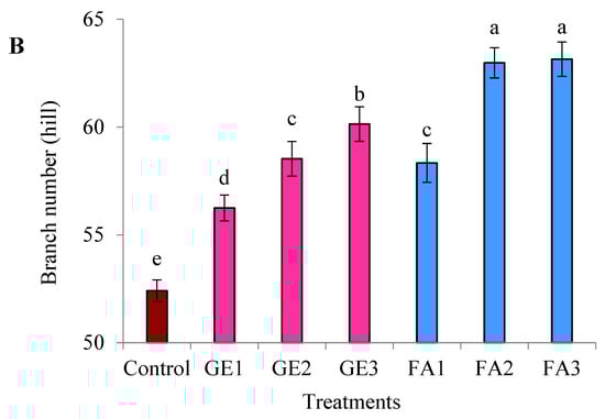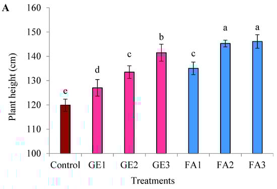 The plant height and branch number were significantly increased as a result of GE and FA applications compared to the control; however, FA treatment was more effective than GE (Figure 1A,B). Increasing the GE level gradually increased both characteristics, and they reached their maximum values when the highest level was applied (15 mg L−1). The same trend was recorded by FA treatment, but without significant differences between the 3 and 5 mg L−1 treatments.