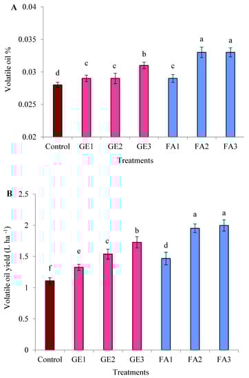 Effects of foliar spray with ginger extract and fulvic acid treatments on (A) the volatile oil percentage and (B) the volatile oil yield of damask rose plants. GE1, GE2, and GE3 are ginger extract levels at 5, 10, and 15 mg L−1, respectively; FA1, FA2, and FA3 are fulvic acid concentrations of 1, 3, and 5 g L−1, respectively. The data are means ± SE (n = 4). The columns with different letters are significantly different at p ≤ 0.05, according to Duncan’s multiple range test.