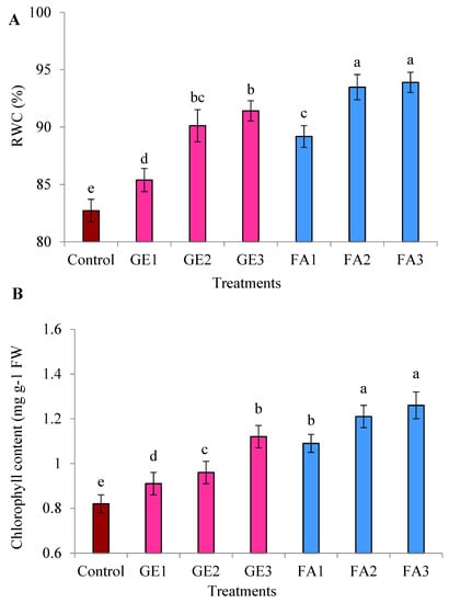 All levels of GE and FA remarkably increased RWC compared to untreated control. This effect was larger for FA (Figure 3A). This increment was gradual, with increasing amounts of GE and FA, but applying the highest levels did not have a significant impact relative to the moderate level.