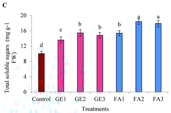 The data presented in Figure 4C clearly show that TCs was significantly increased as a result of GE and FA foliar spraying compared to the control. This effect was larger with FA. Despite the increase in TCs observed with GE3 compared to GE2, the difference was not significant. Among the FA levels, FA2 recorded the highest TCs, and no impact was observed when FA3 was used, since it slightly increased the TCs. Relative to the control, foliar spray with FA3 increased the TCs by 4.02-fold.