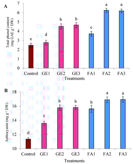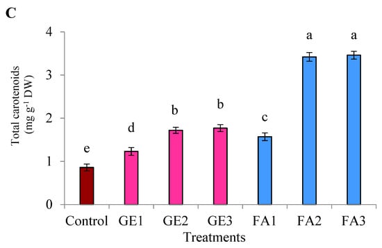 Because of their health-promoting properties, phenolics have gained substantial attention due to their antioxidant activities []. The results in the current study showed that either GE or FA treatments improved the total phenolic content of damask rose flowers in comparison to control treatment. The higher phenolic content in GE-treated plants may be attributed to the higher content of phenolics and flavonoids detected in GE (Table 1) that might have contributed to the improved total phenolic content in damask rose flowers. A similar trend has been observed for other BIOs [,]. Furthermore, the appropriate concentration of minerals and vitamins observed in GE may directly or indirectly affect the metabolic processes in such a way that it enhances the internal phenolic content []. In agreement with current results, Shabana et al. [] reported that the total phenols were improved due to a foliar application of GE in Origanum majorana L. Similarly, FA application enhanced the total phenols in damask rose flowers. It has been revealed that the compounds related to the shikimic pathway, such as phenols, are agitated by humic substances []. In addition, non-enzymatic antioxidants such as phenols and carotenoids have been influenced by the application of humic substances []. In the same context, Bayat et al. [] reported that FA application enhanced the total phenol and flavonoid content in yarrow flowers, which supports the current results. The positive role of FA in improving the total phenolics has been also reported in several species [,].