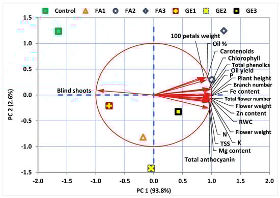Biplot of the principal component analysis (PCA) for the damask rose parameters in response to the foliar application of ginger extract and fulvic acid. The first two principal components (PC1 and PC2) explain 96.4% of the total variation. The circle represents a perfect correlation. The vectors (arrows) represent the variables, and the colored shapes represent the sampling points under various treatments of fulvic acid (FA) and ginger extract (GE) in comparison to the control.