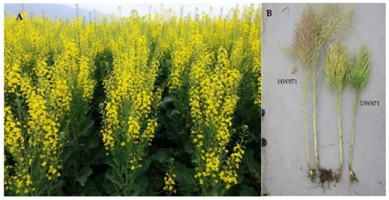 In our experiments, Guizhou Rapeseed Institute provided Brassica napus L. dwarf variety DW871 and control group high variety HW871 (Figure 10A). We used Brassica napus varieties 940, ZS NO.2, and Xiangyou NO.13 to compound cross in many years of hybridization experiments and in the hybrid offspring, we obtained material "5771 R". In subsequent hybridization experiments, we used 5771 R as the male parent and 5824 A as the female parent to create the recessive nuclear sterile three-line hybrid ZH 117. In 2008, we discovered a mutant of the compact dwarf type. After four generations of selfing, we were able to obtain Brassica napus dwarf material (named "DW871") and a homologous tall stalk line (named "HW871") that could inherit plant height traits in a stable manner (Figure 10B).