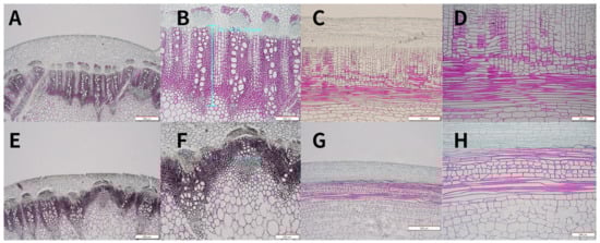 Paraffin sections of stems DW871 (A–D) and HW871 (E–H). (A,E): transverse section of stems (40×); (B,F): transverse section of parenchyma; (C,G): radial section of stems (40×); (D,H): radial section of parenchyma (200×).