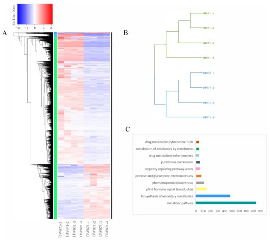 Using illumia sequencing, a total of 275.81 UMI reads were generated, resulting in the assembly of 10141 genes. We identified 8665 DEGs between DW871 and HW871 by FPKM value, which included 2582 upregulated and 6083 downregulated DEGs (Figure 3A). The gene expression profile of biological repeats from the same group showed a high correlation coefficient, whereas samples from different groups showed a relatively low correlation coefficient (Figure 3B).