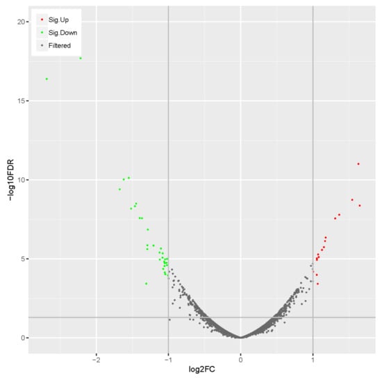 Volcano of DAPs. X axis represents the logarithm of the differential expression level of genes when the base is 2; Y axis represents the logarithm of FDR (false discovery rate) when the base is 10; red, green and black dots represent up- and down- and nonregulated DEGs respectively.