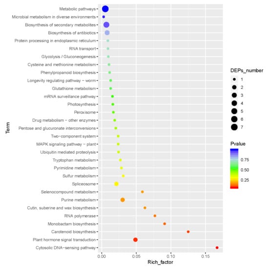 Among the 50 DAPs, 17 DAPs had a KEGG pathway annotation that matched. DAPs are enriched in 31 KEGG metabolic pathways (Figure 5). The top ten KEGG pathways are: cytosolic DNA-sensing pathway (16.67%), carotenoid biosynthesis (12.5%), monobactam biosynthesis (9.09%), RNA polymerase (7.69%), cutin suberine and wax biosynthesis (6.25%), selenocompound metabolism (5.88%), plant hormone signal transduction (4.88%), sulfur metabolism (3.12%), purine metabolism (3.03%), and pyrimidine (2.86%).