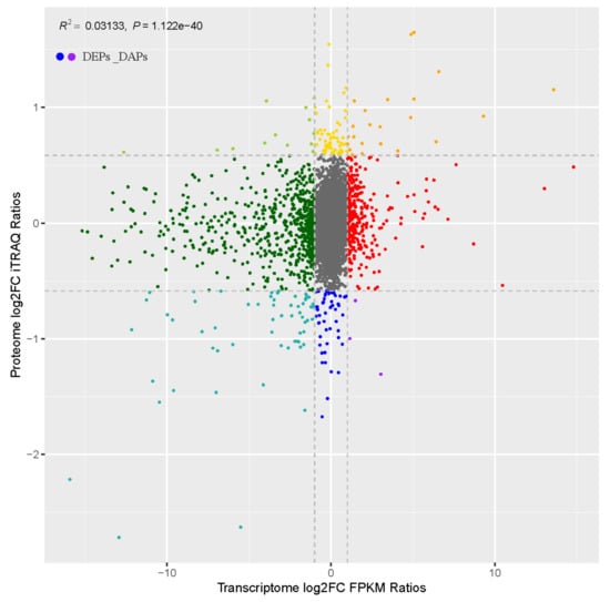 Before connecting the transcriptome and proteome data, it was necessary to screen DAPs (differentially accumulated proteins) and DEGs (differentially expressed genes), the conditions were as follows: (1) FC (Fold Change) ≥ 2 or FC ≤ 0.05; (2) p (p value) < 0.05. We believe that the DAPs or DEGs are upregulated when FC ≥ 2, p < 0.05, the DAPs or DEGs are downregulated when FC ≤ 0.05, p < 0.05. In order to calculate the expression level of DAGs and DEPs, and eliminate the differences in exon length and total read count between samples, we further processed the data through FPKM (reads/(fragments) per kilobase of exon model per million mapped reads) and TPM (transcripts per kilobase of exon model per million mapped reads) (1 and 2).