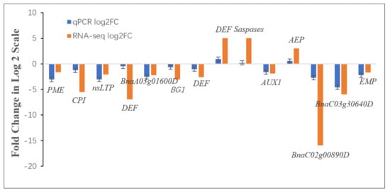 Except for two opposite correlations (BnaAnng37980D, BnaC03g30640D), 23 correlations have the same changing trend. There is research that has predicted that BnaC03g30640D might participate in the formation of plant vascular tissue. The other 23 correlations can be divided into four groups: (1) metabolism-related genes: XET, CEI, BG1, LOX, SEP, and AEP, among others, endopeptidases are all upregulated, while other correlations are all downregulated; these correlations involve lignin and pectin degradation, fatty acid metabolism, and protein hydrolysis; (2) defense and stress response: thaumatin, SD, DES, Bet 4 1, PHI1, and ER transmembrane protein are all downregulated, possibly due to external pressure; (3) transmembrane transport of substances: nsLTPs, AAT, and FAR play an important role in the transmembrane transport of hormones and signals between cells, as well as the regulation of transmembrane transport channels by cells; (4) transcription: RNA binding is important in the process of protein transcription and translation.