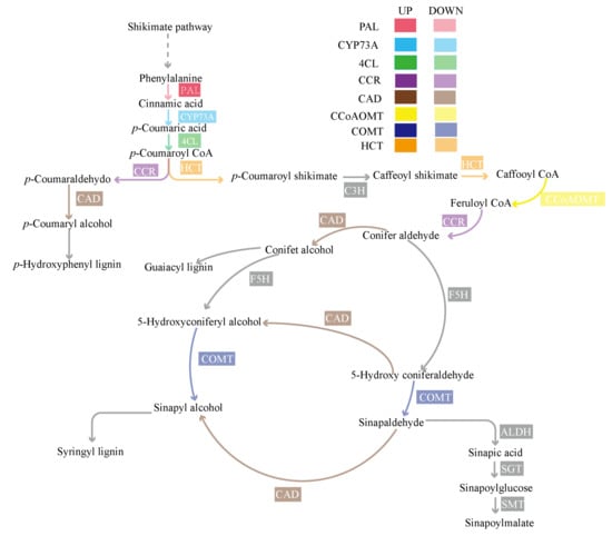 The foregoing results supposed the important relationship between dwarf and cell wall extension and lignification. It indicates that lignin may play a role in dwarfing. To further reveal the relationship between lignin synthesis and its component and dwarfing phenotype, we analyzed the pathway of phenylpropane biosynthesis (Figure 9). Phenylpropanoid biosynthesis includes the common pathway and the specific pathway [35].