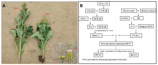 Brassica napus L. HW871 and DW871, the small picture shows the inflorescence segment (HW871: left, DW871: right) (A); Breeding process of DW871 and HW871(B).