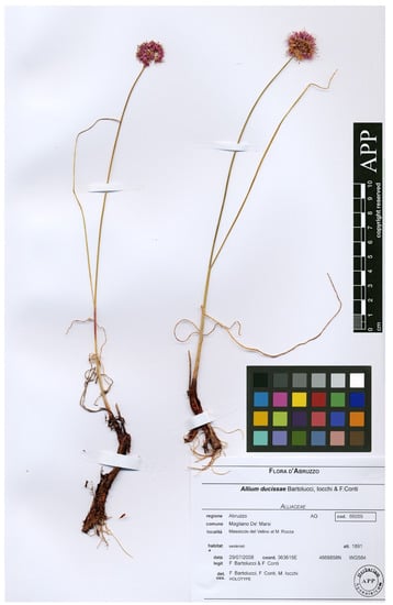 Holotype of Allium ducissae (APP No. 66059, reproduced with permission of the Herbarium, Centro Ricerche Floristiche dell’Appennino, Italy).